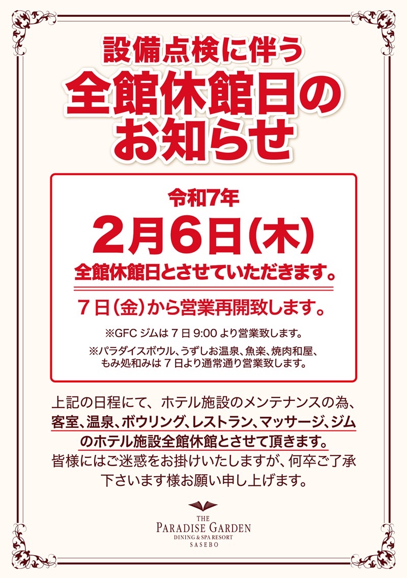 2025.02.04(火) 6日(木)設備点検による全館店休日のお知らせ