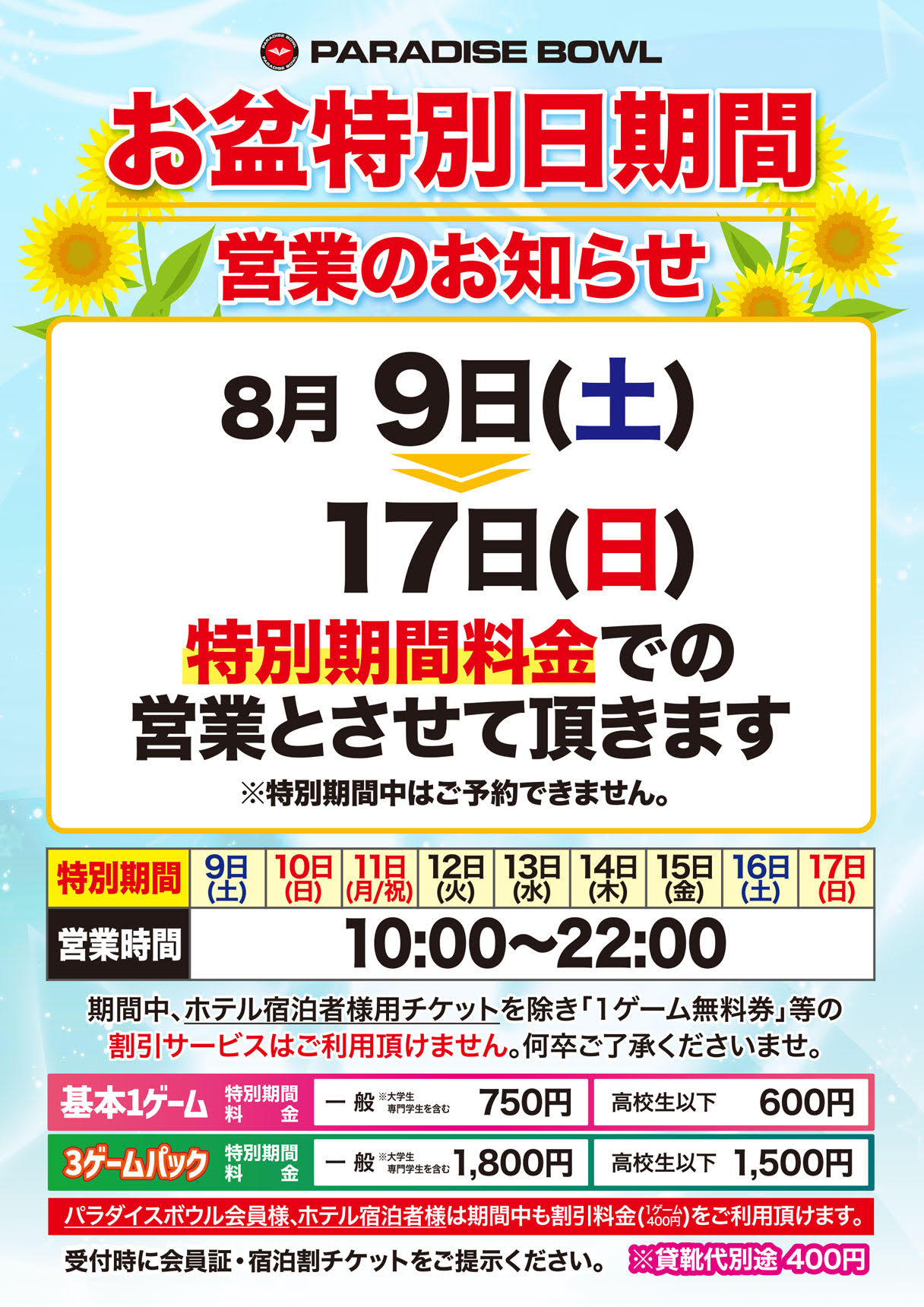 お盆特別日期間に伴い、2025年8月9日(土)~8月17日(日)の期間中は、特別料金での営業とさせて頂きます。